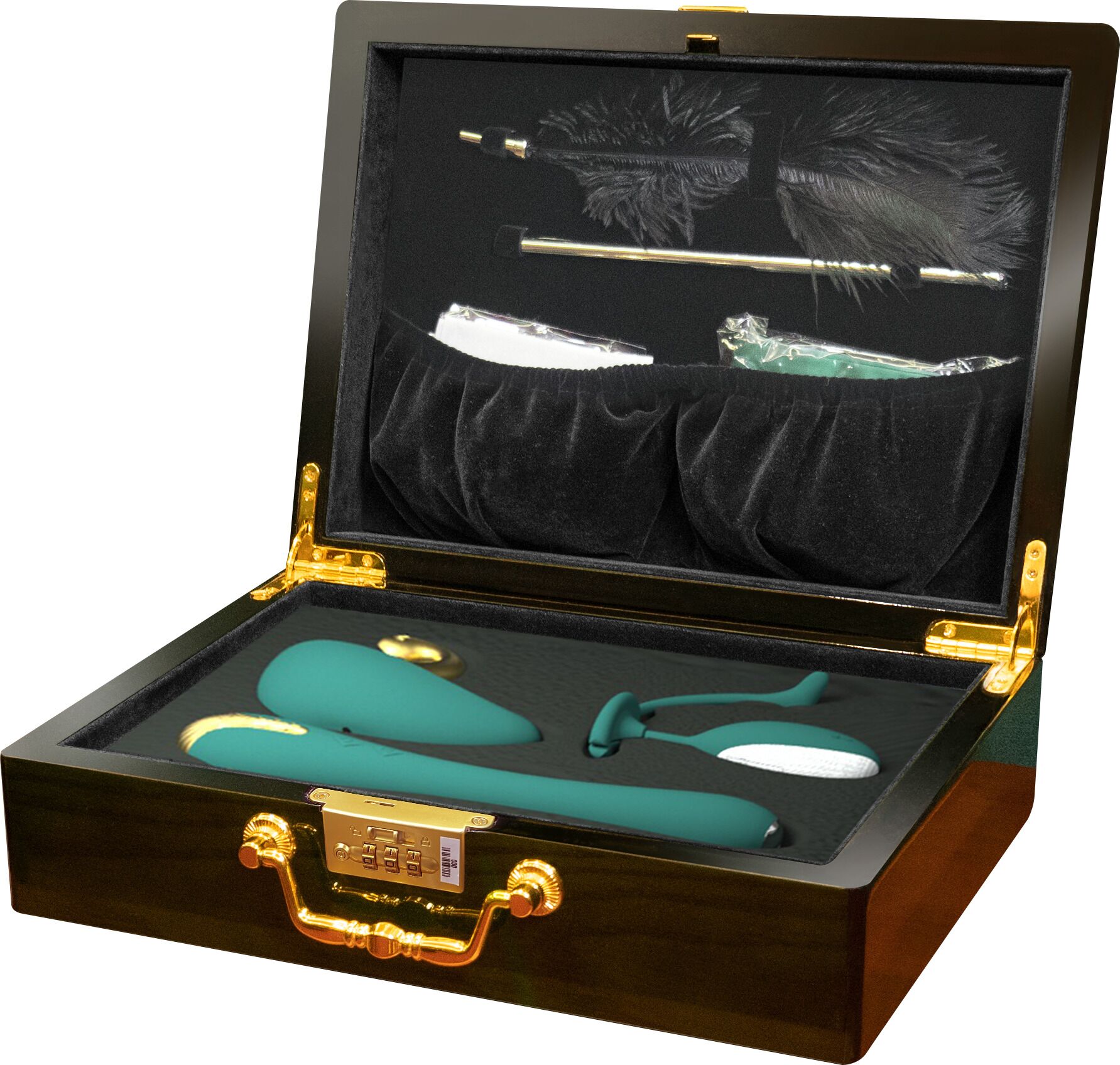 Кейc Pandora Box выполнен из материала под полированное дерево с золотистой фурнитурой и оснащен надежным кодовым замком. Внутри — специальные отделения для каждой игрушки, крепления для аксессуаров и бархатные кармашки для зарядных кабелей и инструкции.