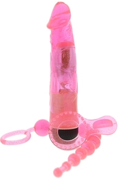 Набор Glitter Play Kit от голландского производителя Dream Toys - это все, что необходимо для жаркого и романтического викенда на двоих. В комплект входит три предмета: эрекционное кольцо, анальная цепочка и вибромассажер. Побалуйте маленькими неожиданностями своего партнера.Все игрушки созданы из качественного материала ПВХ, который не содержит фталатов и других вредных примесей. Вибромассажер имеет реалистичную форму с ярко выраженной головкой и многоскоростную вибрацию, длина - 16,5 см, диаметр - 3,5 см, работает от двух батареек типа АА. Анальная цепочка создана из постепенно расширяющихся шариков, длина - 25 см, диаметр - 0,5-2см. Эрекционное кольцо со стимулятором для клитора достаточно эластичное, поэтому подойдет для любого размера пениса.