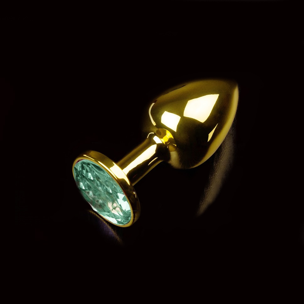 Малая золотистая анальная пробка с кристаллом. Материал - металл. Длина - 7,5 см, диаметр - 2,7 см.