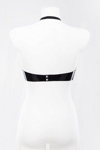Латексный бюстгальтер с открытой грудью плотно прилегает к телу, подчеркивая изгибы тела и создавая соблазнительный силуэт. Регулируемые бретели обеспечивают удобную посадку, а застежка сзади позволяет легко надевать и снимать бюстгальтер.