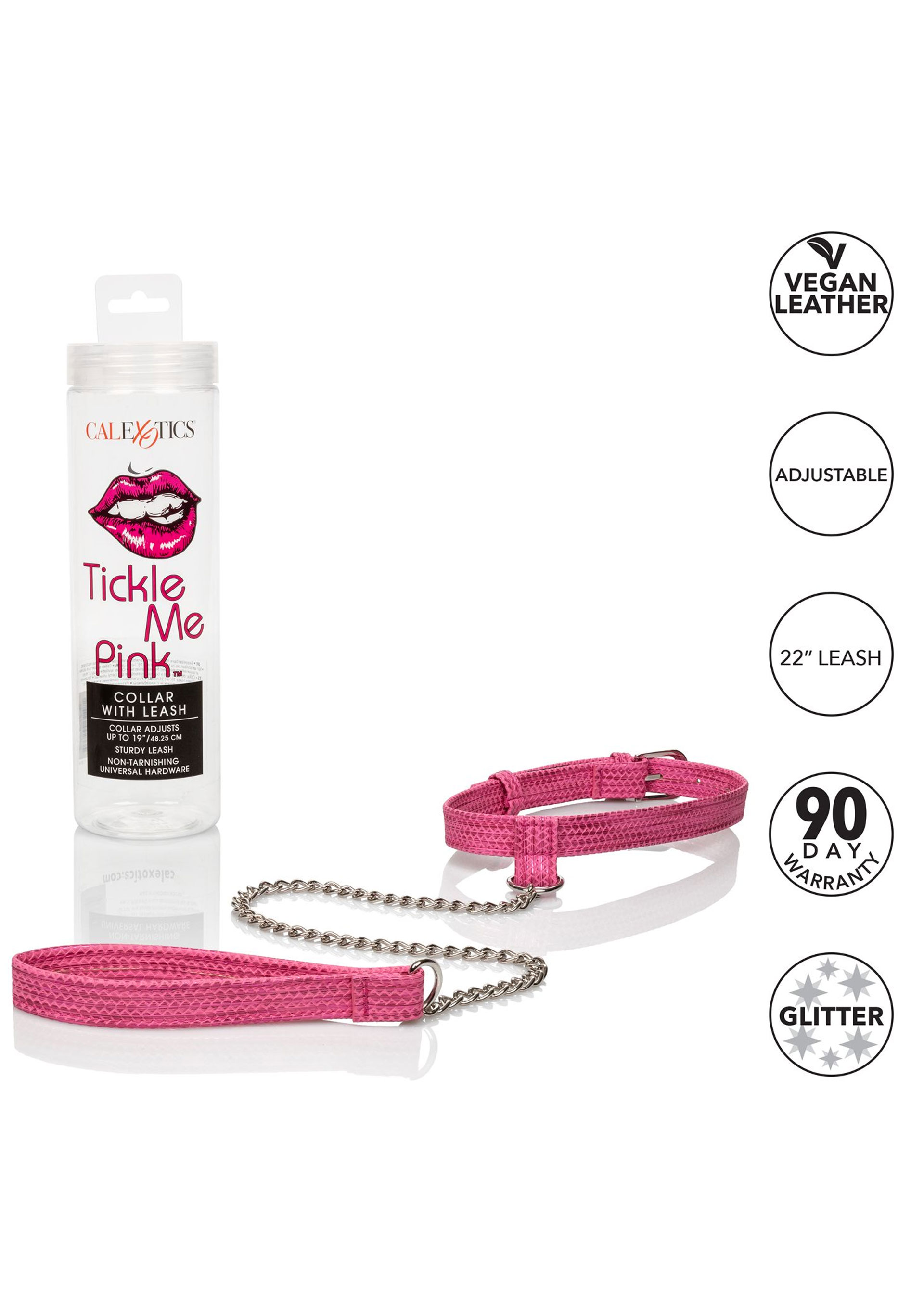 CalExotics Tickle Me Pink Collar w Leash — дизайнерский набор из ошейника и поводка, который добавит нотку стиля вашей игре в спальне. Этот роскошный комплект изготовлен из мягких высококачественных материалов и оснащен регулируемым ошейником с подходящим поводком. Игривый розовый цвет добавит веселья и кокетливости вашим интимным моментам.