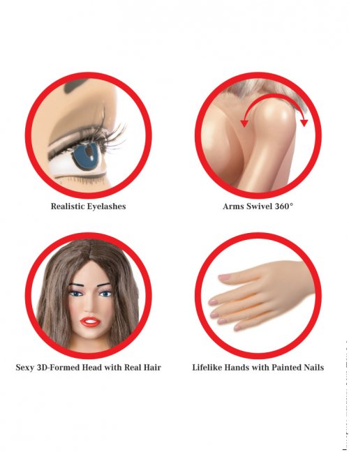 • невероятно реалистичный внешний вид надувной секс-куклы. Здесь производитель применил весь свой профессионализм в процессе изготовления. Поэтому присутствует сексуальное лицо, изготовленное с использованием 3D технологий. Глаза достаточно выразительные, присутствуют даже пышные ресницы, на голове - реальные мягкие волосы;